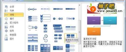 3弹出选择SmartArt图形对话框,在该对话框中选择:流程→重复蛇形流程,如下图所示。