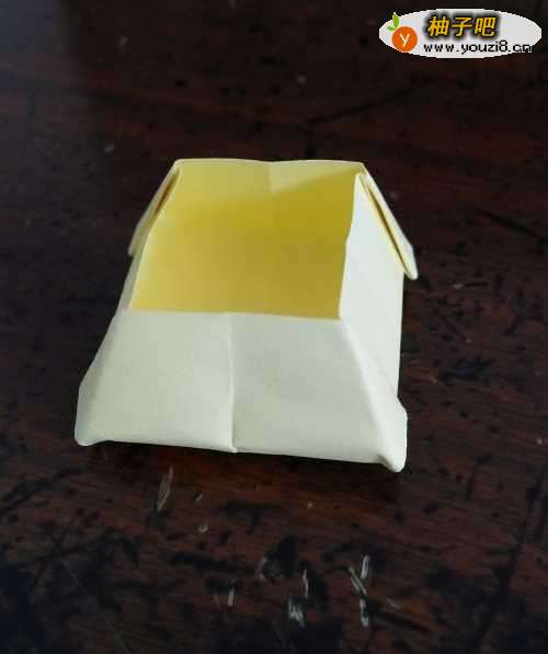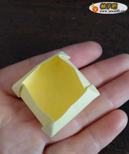 7粘好后,我们把折纸从底部用手指撑开就会形成一个梯形的收纳盒。下面是简易梯形收纳盒的完成图。