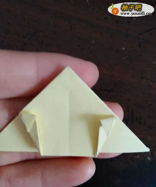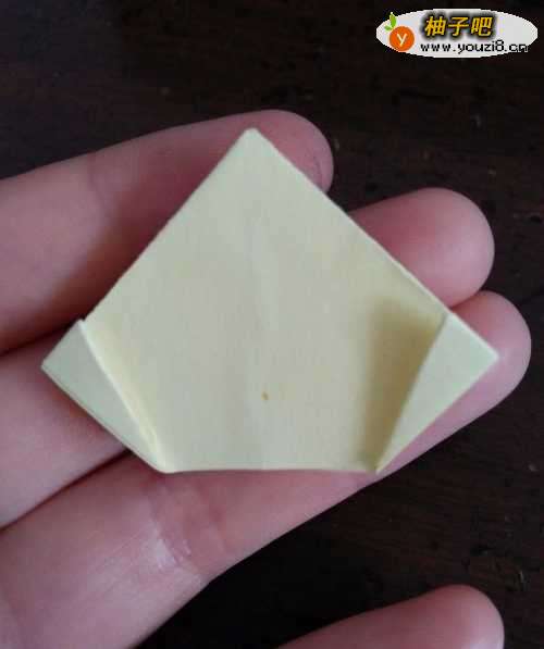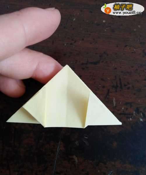 4我们把彩纸两侧的底角分别翻折,如第一张图。我们再把刚才的边接着向内翻折,如第二张图。