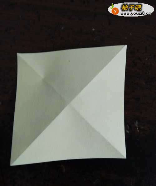 2接着我们把彩纸翻到另一面,我们再把彩纸的两条中线分别对折,同样还是要折痕,如第二张图的样子。