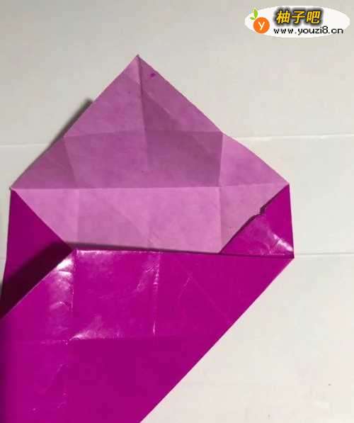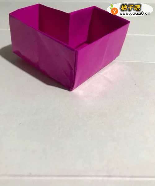 7第七步 折好一个普通的盒子之后 把它翻过来找一下刚才折的折痕 然后按折下一个角 再捏折两个拐弯处 最后整理一下 一个美观看漂亮的爱心盒子就折叠完成了