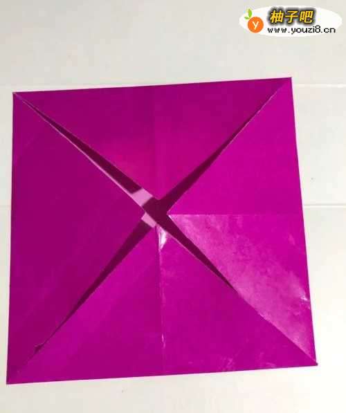 2第二步 折好之后 全部展开 然后掀起一个角向里折叠至中心点 其它三个角同样都对齐中心点折倒