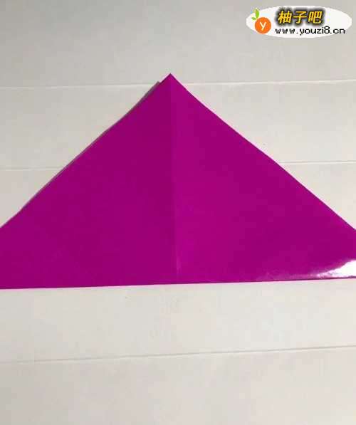 第一步 取一张16厘米X16厘米的正方形二红色彩纸 先从下向上对角折一遍 然后把它开启竖起 再从下向上对角折