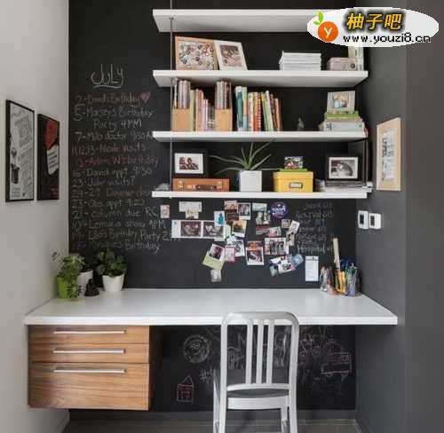 3不一定所有人都是土豪,小户型弄个书房,难道人要睡在客厅里??相信谁家都能有这样一个不足5㎡空间,就用白色的搁板和满铺的黑板壁纸为自己建一个独立的工作空间。我知道,黑白控的你,此时已经爱上了这个角落。