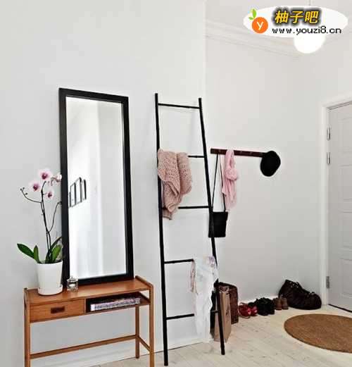 5玄关怎么呢搭?中国人对玄关的搭配总是要讲究很多风水学,能说“不要这么累好吗”就这么黑白配原木的搭一下试试。省去进门厚重的玄关衣柜,弄一个能随意移动的梯子挂衣服,旁边配上黑色落地镜,两者和墙面的白色形成了完全的颜色对比,白炽灯的照射下,整个门厅格外的明亮有木有。就这样一两件家具,让你的门厅变得与众不同。建议何种租房住的同学来一发。