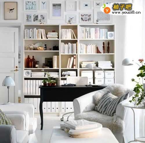 如果我们在视觉上自动屏蔽地毯和写字台,就这样一白到底会怎样?小暖想说,这是要洗死谁的节奏。可当视线中出现了颜色上明显反差的黑色法式写字台时,让你总是忍不住看了黑色看白色,不是说它有多么好,但就是谁都替代不了,这就是软装色彩搭配的魅力。当白色做为客厅的主色时,一件大型的黑色家具就能与之相配,在摆放几盆绿植,整体效果~~~ perfect