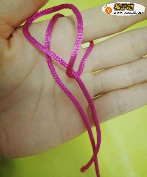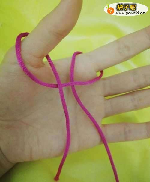 5把整个编绳从食指上取下来,但是以前套在食指上的圈,全完不能和别的线弄混了哦。再按照图上的箭头把2个线头按照方向穿过去。