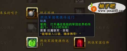 玩具燃烧军团便携传送门是魔兽世界7.0以后新增的玩具,属于抗魔联军声望的可购买道具。获取方式如下: