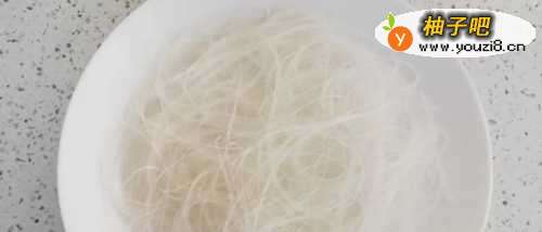 44. 将泡软的粉丝,用剪刀剪成两段,打散,平铺在事前准备好的盘中。