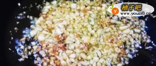 77. 立刻放入剩下的另一半蒜末,用余温爆香,用铲子翻炒一下。爆香均匀后,将蒜末油倒入一个干净的碗中。