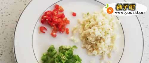 66. 将小米辣切碎,线辣椒切碎,将大蒜切成蒜末,装盘备用。锅中倒入适量的花生油,油温烧至6成热,加入一半切好的蒜末,炸成金黄色,然后关火。