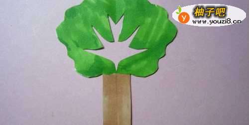6最后,用浅绿色的马克笔,在剪出的好看的大树的树叶图形上,涂颜色,注意颜色要涂均匀,并用浅棕色的马克笔在好看的大树的树枝图形上,涂上颜色,这样一个好看的大树剪纸手工就制作好了,如下图所示。