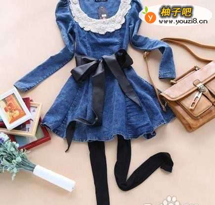 4蓝色的牛仔面料的连衣裙,挺括的面料,让裙裙具有立体的线条感,弧度质感的衣领采用了纯白色的蕾丝菲边进行点缀,透露出浪漫的色彩,宽大而立体的蝴蝶结腰带搭配,让线条更为的分明。