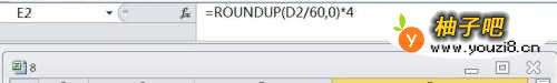 3在EXCEL中,启用【8.XLSX】后,选择【E2】单元格,在编辑栏中输入公式【=ROUNDUP(D2/60,0)*4】,如下图所示。