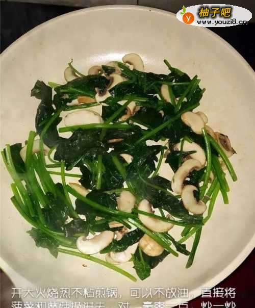 3开大火烧热不粘煎锅,能不放油,直接将菠菜和蘑菇倒进锅里炒,直到出水疲软,调到中火,再炒几下,出锅!