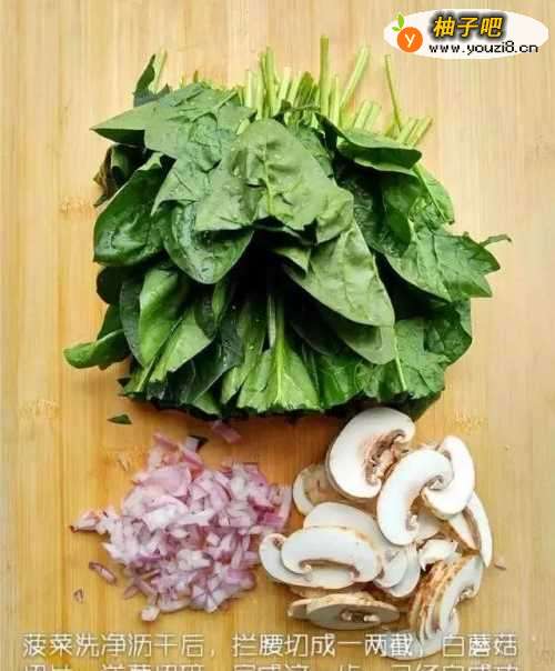 菠菜洗净沥干后,拦腰切成一两截,白蘑菇切片,洋葱切碎。