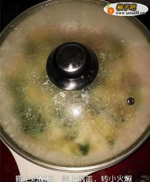 5撒上奶酪碎,盖上锅盖,转小火焖至奶酪融化