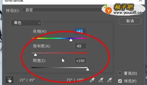 5接着再将明度调到最高,饱和度调到最低,色相稍微调高一点,点击确认
