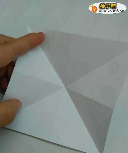 2我们再把彩纸翻过来,然后把两条对角线向内对折。按照折痕把折纸向里折如图。