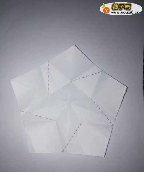 6重新按照图中虚线折好,用手按照折痕折成五角形。翻到背后,如图: