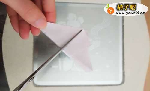 2把另一边角对着米字型的焦点对折,折好后再把一边向后折。如图: