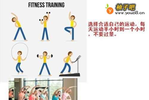 瘦身运动:瘦身运动一定要选择适合自己的运动,如慢跑、打球、跳舞、健身操、去做瑜珈等,一定要让自己的身体发热下来,燃烧体内的卡路里,但任何一项瘦身运动都要注意一个度,运动半个小时到一个小时就能了。