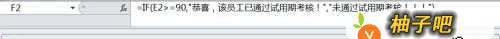3在EXCEL中,启用【8.XLSX】后,选择【F2】单元格,在编辑栏中输入公式【=IF(E2>=90,"恭喜,该员工已通过试用期考核!","未通过试用期考核!!!")】,如下图所示。