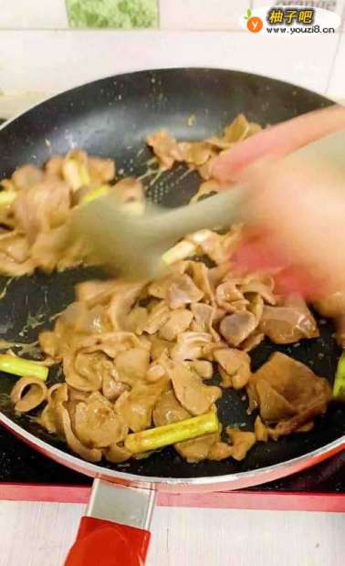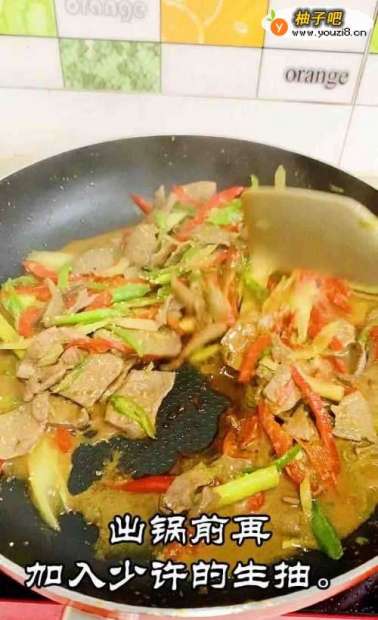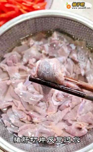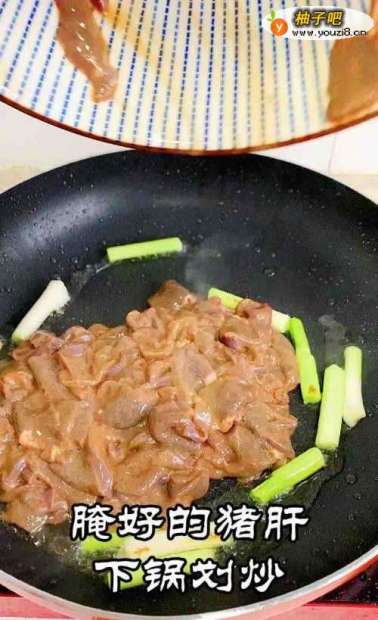 4用生粉蚝油酱油白糖挂味猪肝,再将其刚下锅划炒。