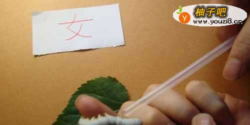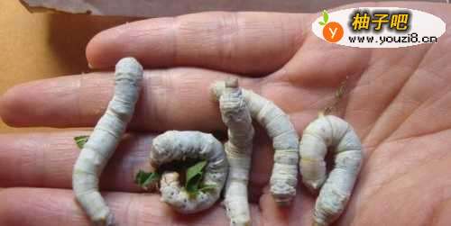 接着,从养蚕宝宝的纸盒里挑选大些的蚕宝宝,摆放在手上,如下图所示。