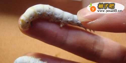 然后,取一条蚕宝宝爬在手指上,近距离观赏察,能发现蚕宝宝腹部上都有节点,如下图所示。