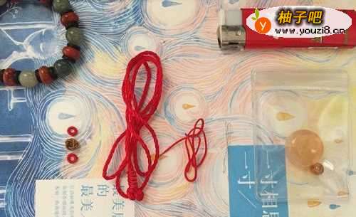 准备工具材料,工具首要有剪刀、打火机、细铁线,材料有平安扣,顶珠,主粗绳,细绳(20公分差不多够了),主绳配件,准备好后就能了开始了~