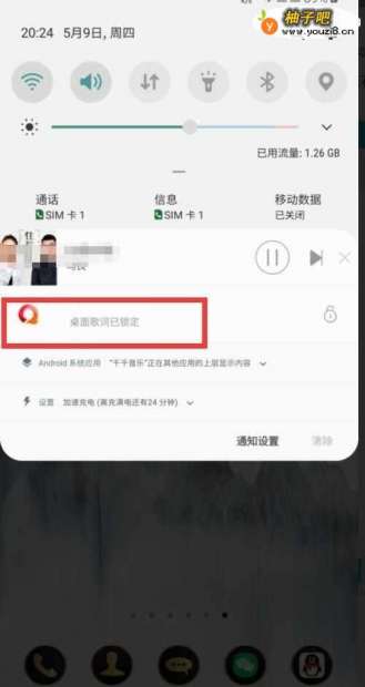 2若歌词被锁定,需下拉通知栏,进行歌词解锁。