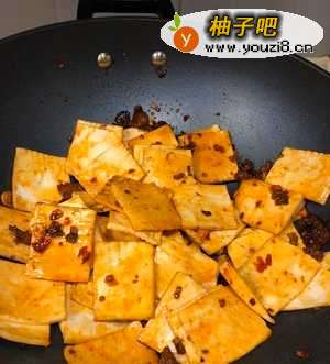 3放入千叶豆腐,翻炒2分钟至全部染上辣椒色。