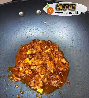 2肉末下油锅煸炒至变色,加葱姜蒜末和2勺郫县豆瓣酱,爆香。