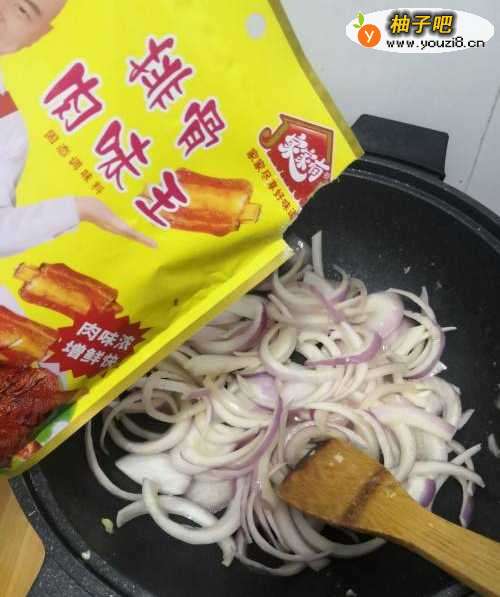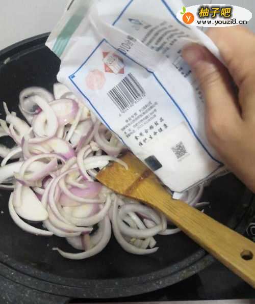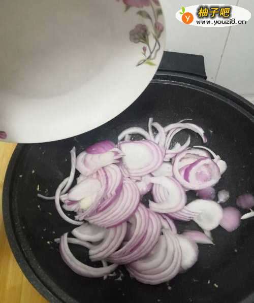3锅中留油倒入洋葱翻炒。