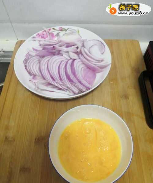 洋葱切丝、鸡蛋加盐打散备用。