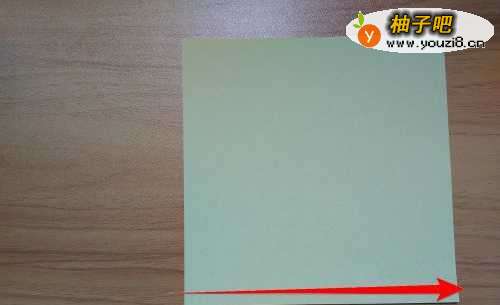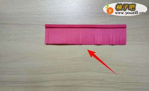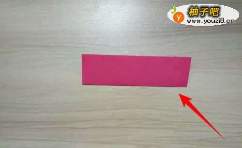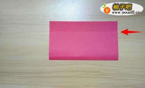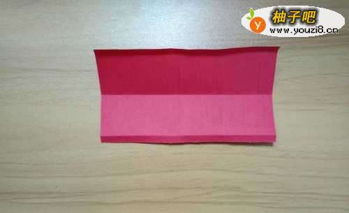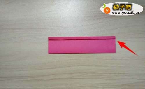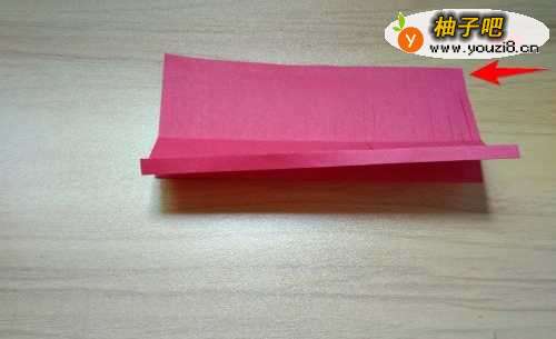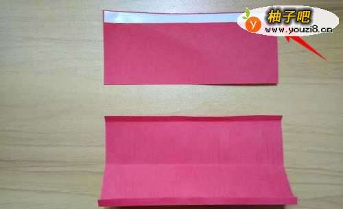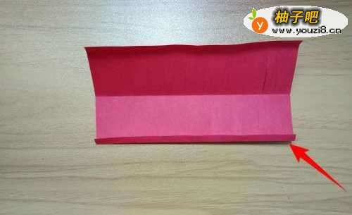 2拿出红色彩纸往上折到如图箭头所指的位置线。