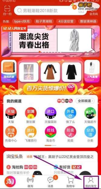 6抽到礼品以后,回到手机淘宝首页,在首页右下角点击【我的淘宝】。