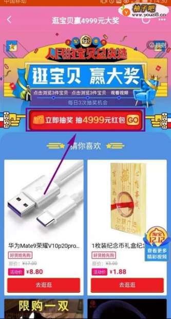 4点击浮动窗口以后,跳转至活动页面,通过活动页面信息可知,我们需要查询三件上篇,然后获得领取资格。查询商品以后,点击【立即抽奖 抽4999元】浮动条,如图所示。