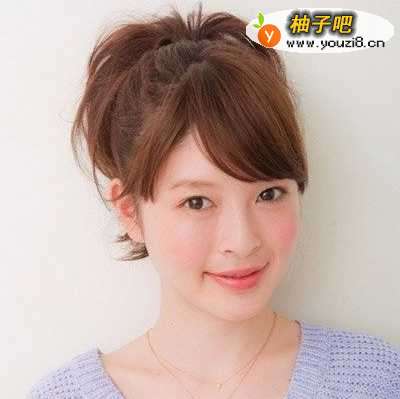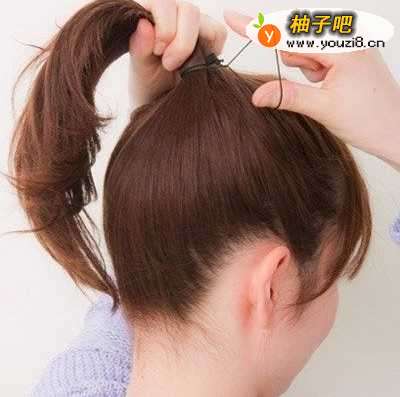 3梳理出刘海,然后将头顶部分头发梳理出来用皮筋束住