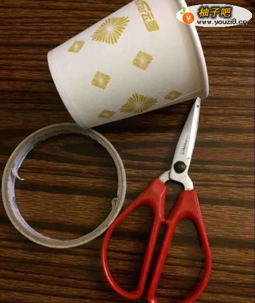 4再取一个纸杯,剪下纸杯的底部。把底部缠一圈双面胶。