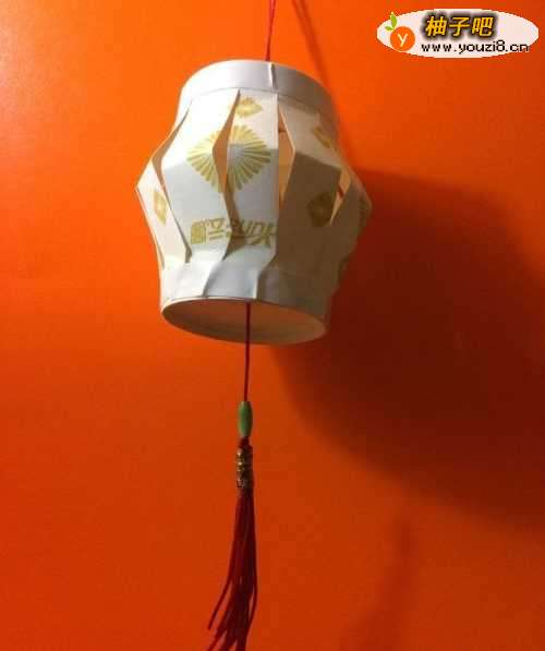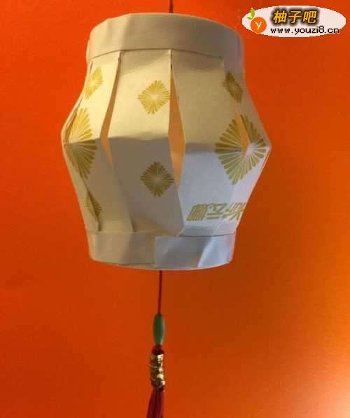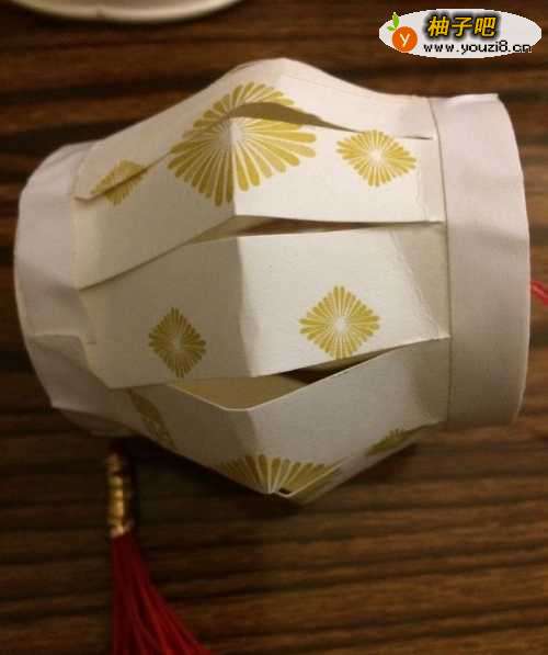 9粘贴好后上下按压一下就成灯笼的形状了。这样按压的缺点就是会有折痕,如果在封顶之前,把纸条卷一些弧度会好看点。这样儿童自制简单的灯笼就做好了。