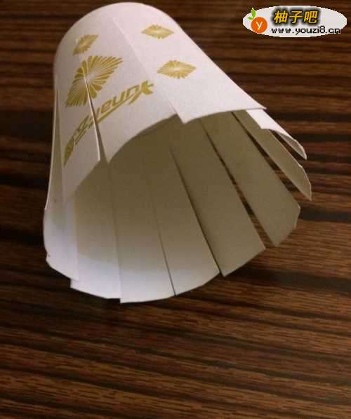 7接着把剪好的尖尖部分一个挨着一个粘贴在另一个杯底上面。粘贴前最好把剪开的纸条弯点弧度这样做好后上面不会有折痕。