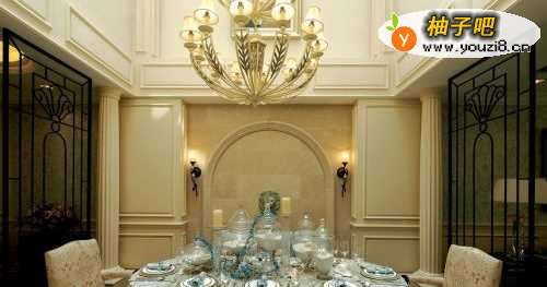 2这张效果图出现的物品有罗马柱、石膏阴角线、石膏线条、拱形、多层吊顶。大量的柱体最早出现与古希腊时期,在罗马帝国最为盛行,而后人大多称期为罗马柱,凸显出浓烈的欧式古典元素之一。墙面借用石膏线条与主体结合突出整个空间的对称与层次,石膏线条勾勒出拱形,体现罗马时期拱券的建筑美学创造,凸显欧式风格古典美学的韵味。象形挂饰体现古老文化历程。多层吊灯体现出欧式风格特有的富丽堂皇,展现出高贵的皇族体系。