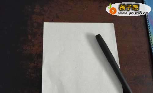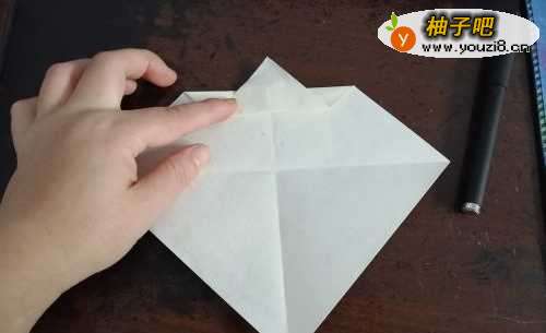 首先准备好一张正方形的彩纸,一只黑色水彩笔。先把彩纸的两角对折,如图。
