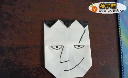 6我们再把下边的角向上折,然后翻到正面,我们给彩纸画上科学怪人的表情就能了。