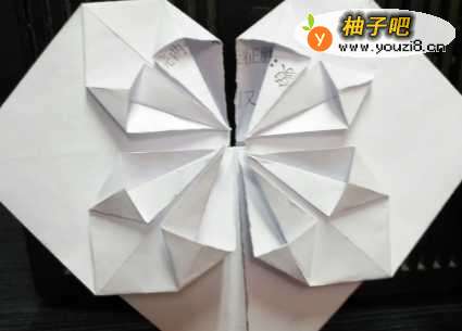 7接着将上面的三耍颂趣角形往后折叠,立体心形就折好啦。