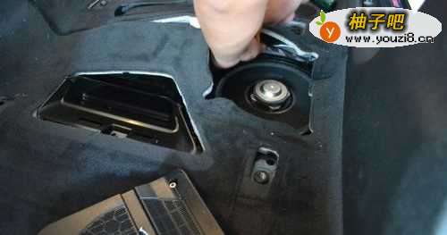 5哈曼低音施工过程:原车低音的位置是在主副驾驶靠后的下面,拆下座椅后能看到原车的低音