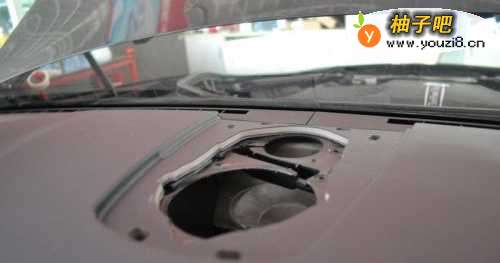 2后排喇叭施工过程:后排喇叭位置在 后挡风玻璃的下面,撬开盖板,原车只有一个中音,高音位置是空的