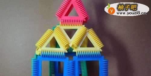4然后拼装金色的娃娃的肩膀的部分。由三个三角形积木所组成。摆放的位置,如下图所示。
